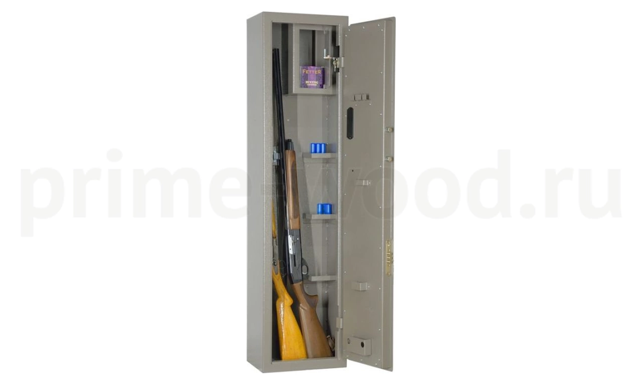 Шкаф односекционный, на 2 ствола оснащен съемными полками и отделением под патроны. Ложементы — металлические держатели с резиновыми роликами. Максимальная высота устанавливаемого оружия — 1380 мм. Два замка, один из которых - электронный.